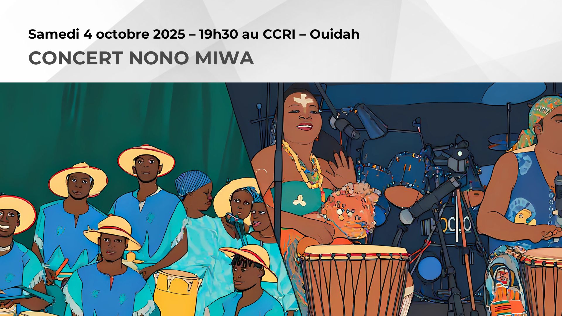 Le CCRI de Ouidah accueille en concert Nono MIWA, artiste béninoise à la carrière internationale riche de plus de 30 ans. Engagée et passionnée, elle revient sur sa terre natale pour partager ses créations et l’énergie d’une musique qui mêle émotion, danse et transmission.